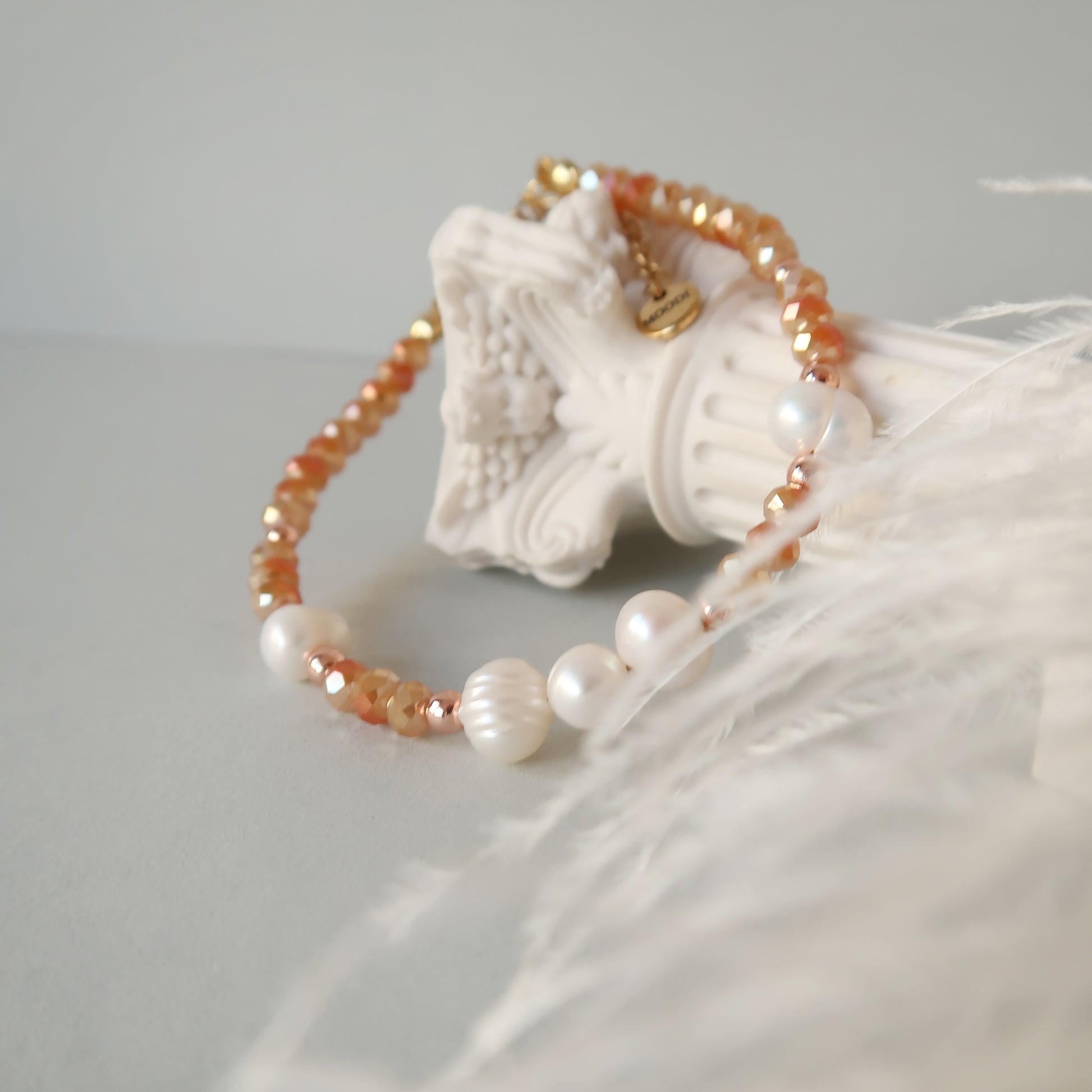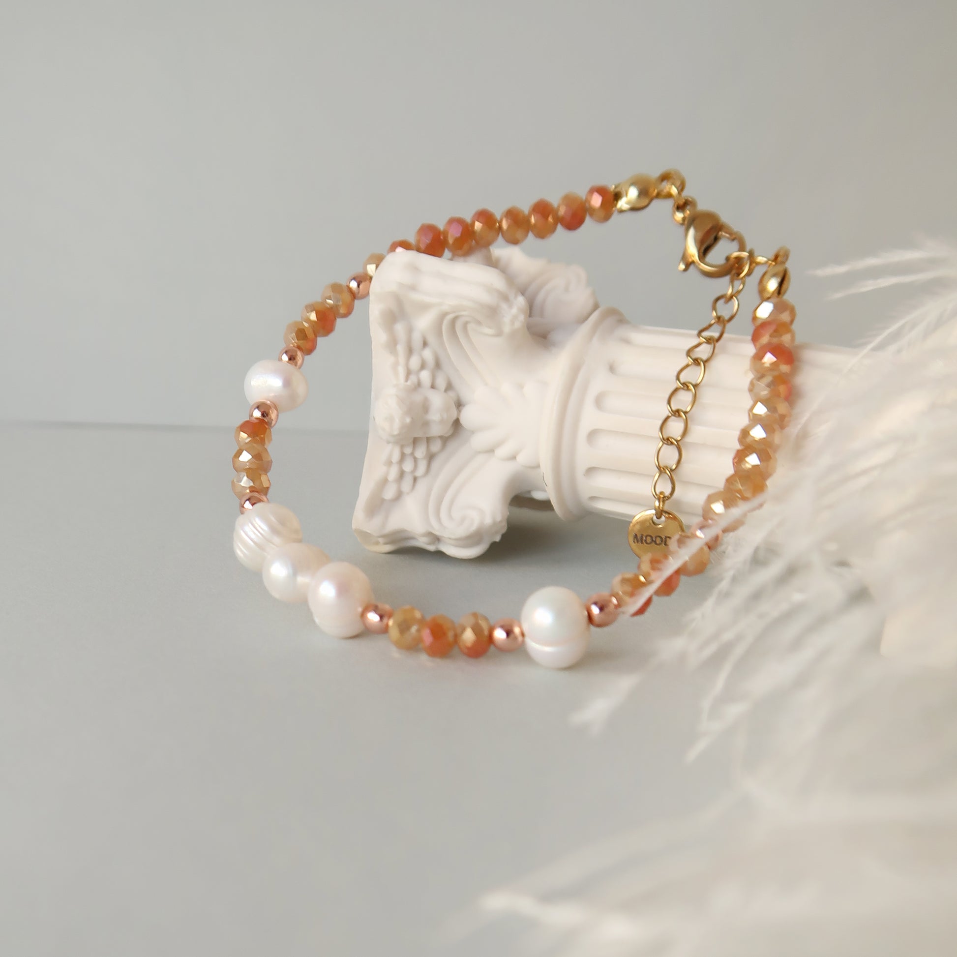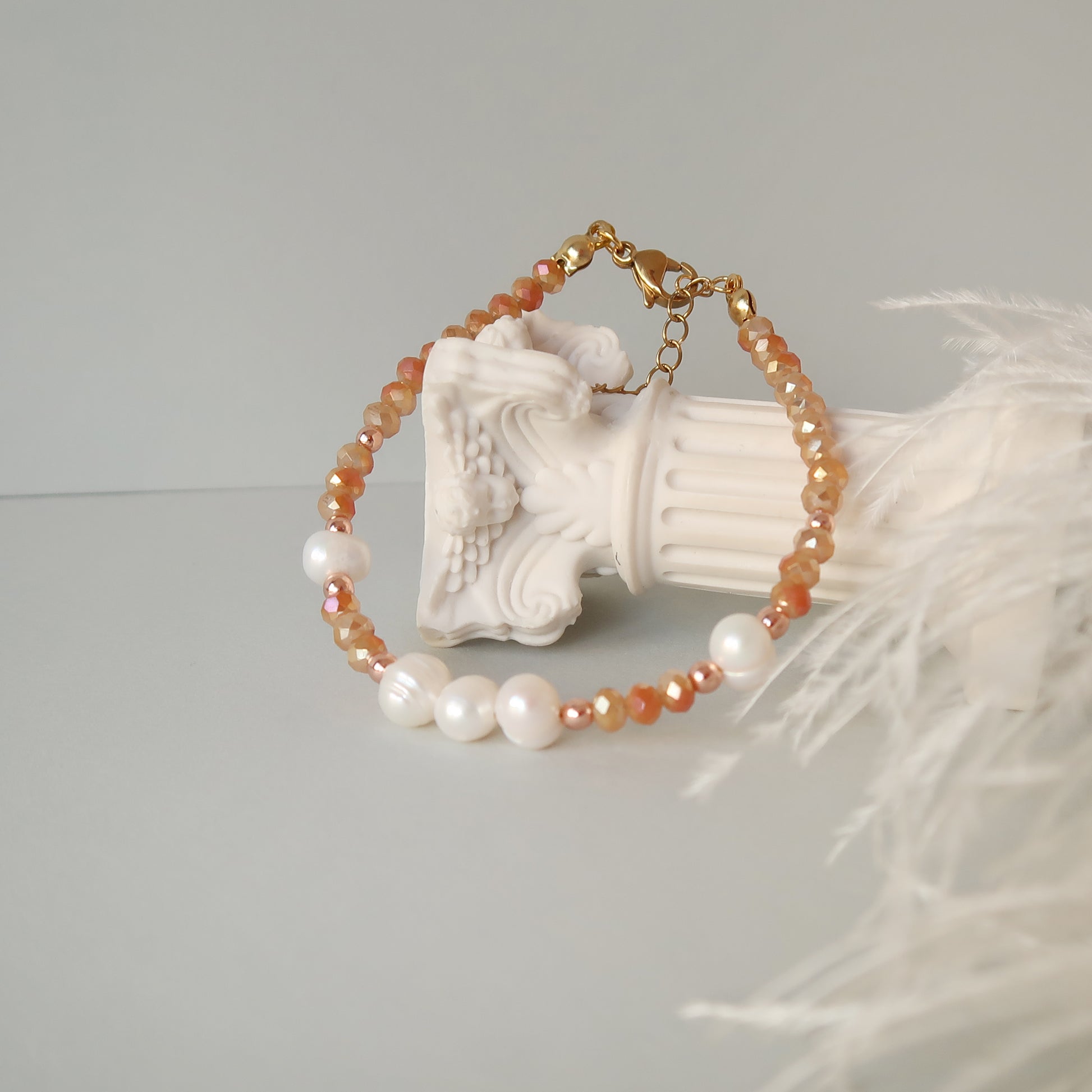 Естествени сладководни перли, бляскави стъклени мъниста. Закопчалки от медицинска стомана с позлата