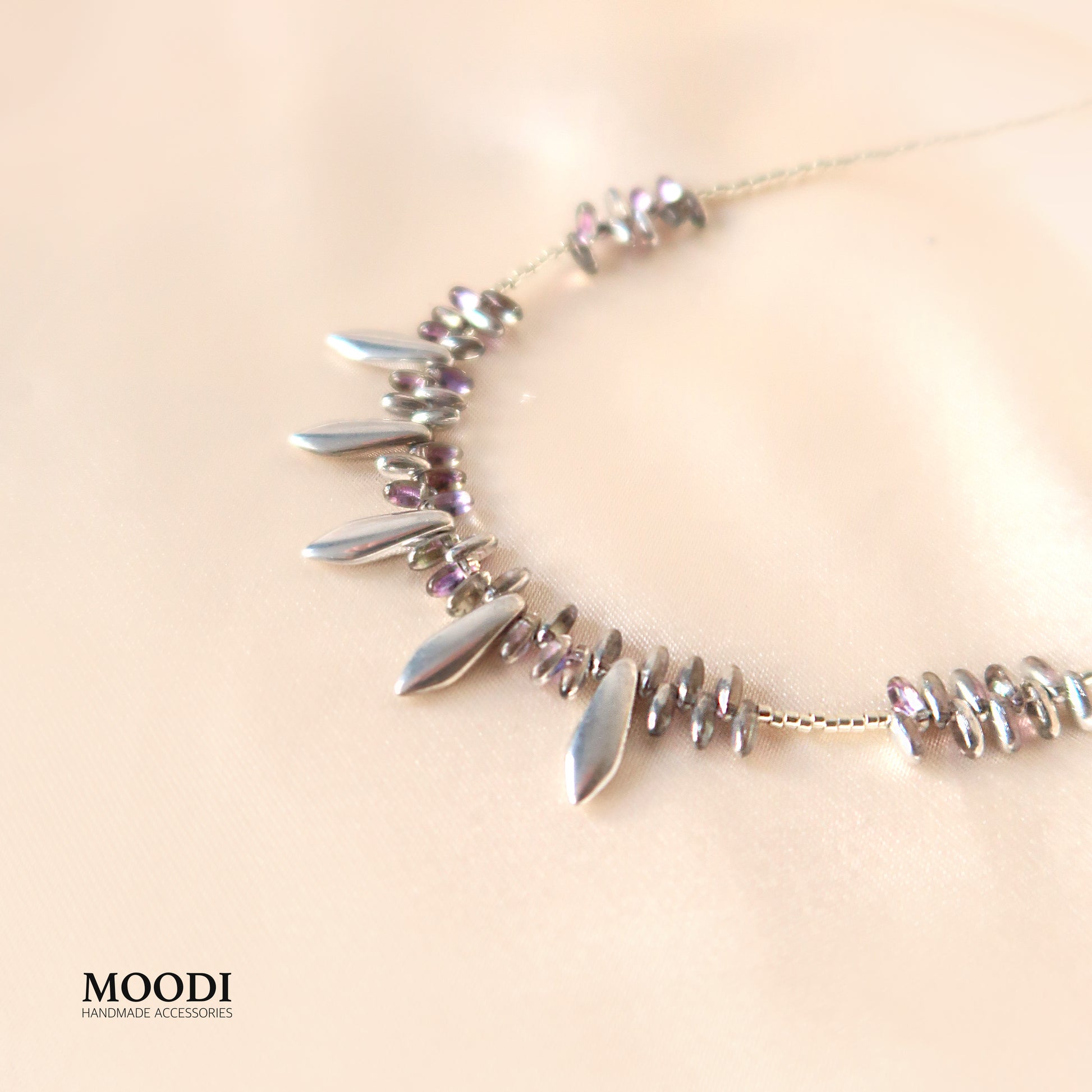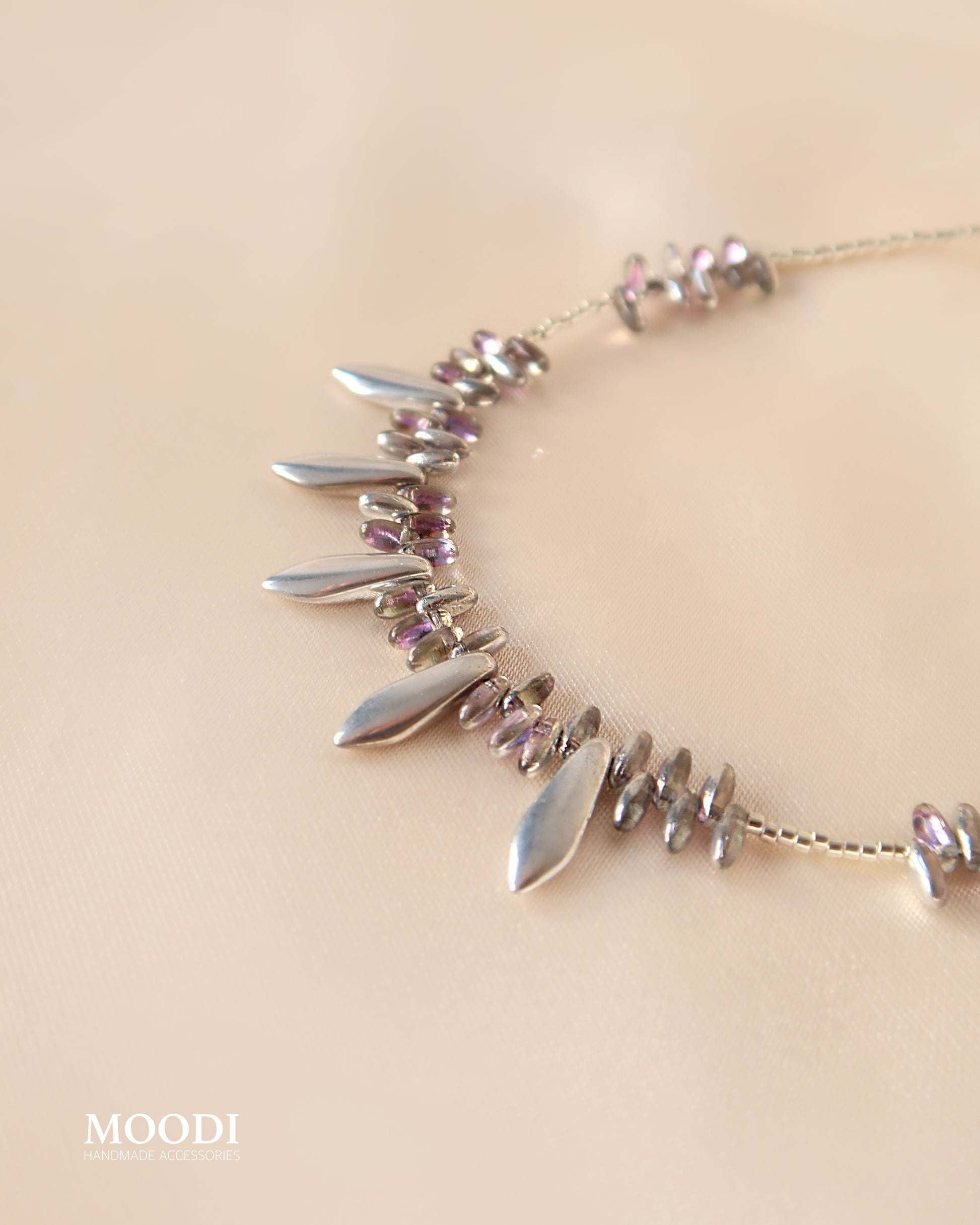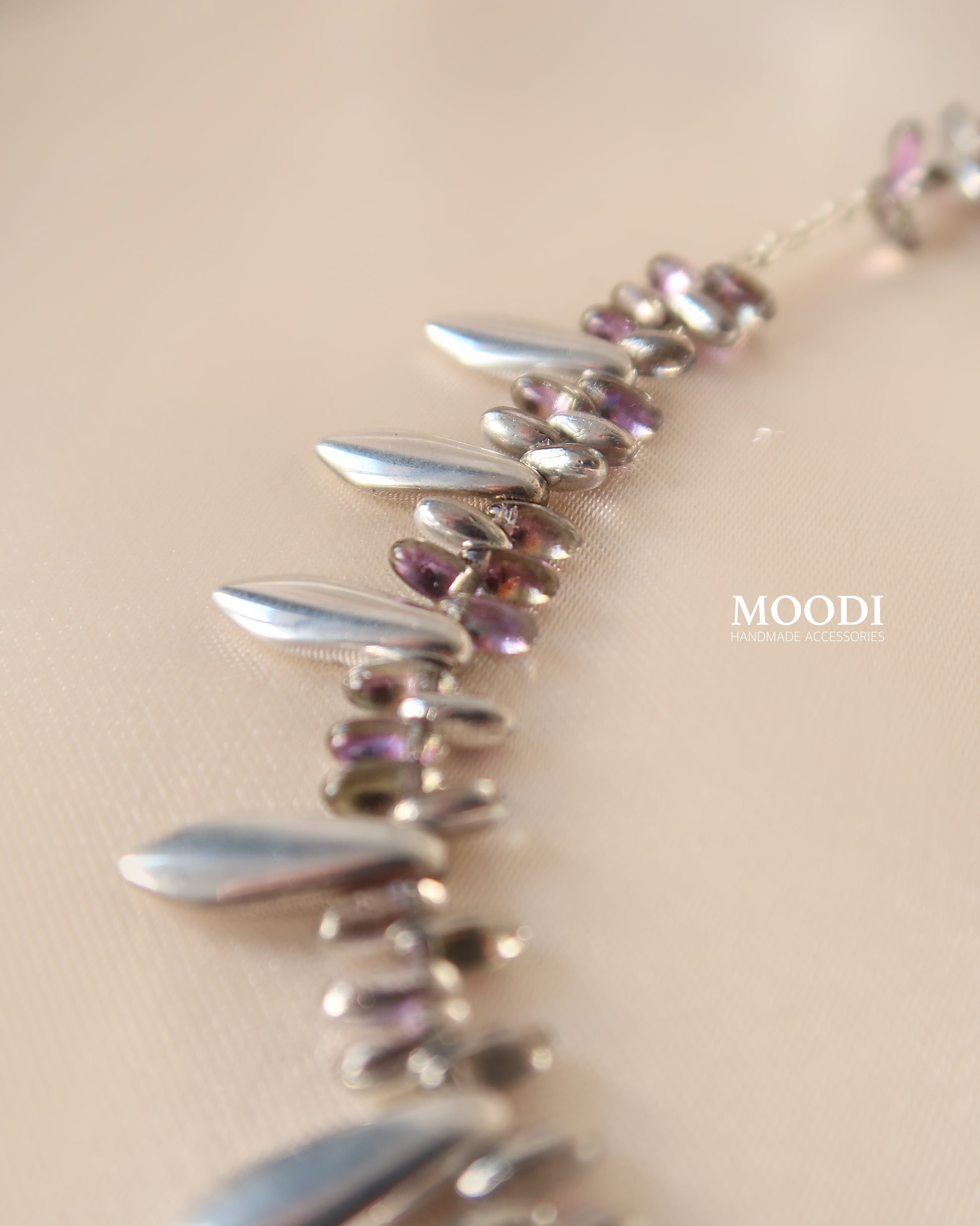 Сребристо с нежни лилави отблясъци – много фин, елегантен и леко артистичен модел.